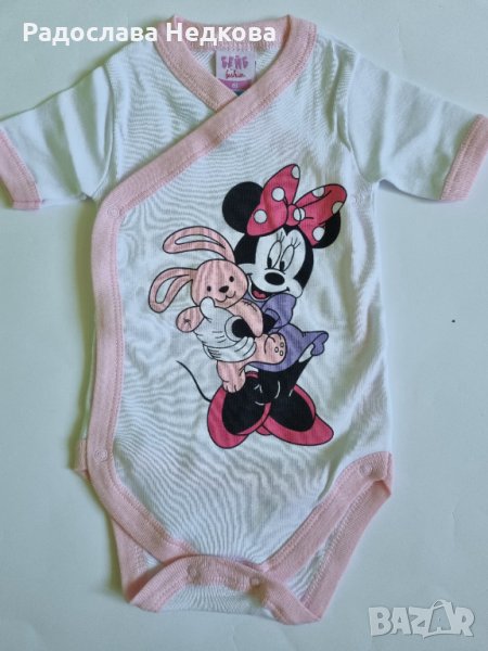 Страхотно боди с къс ръкав със странично закопчаване и апликация на Мини Маус. Българско производство! Налични размери - 68 см. Цена 6.90 лева за 1 брой!