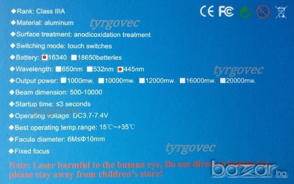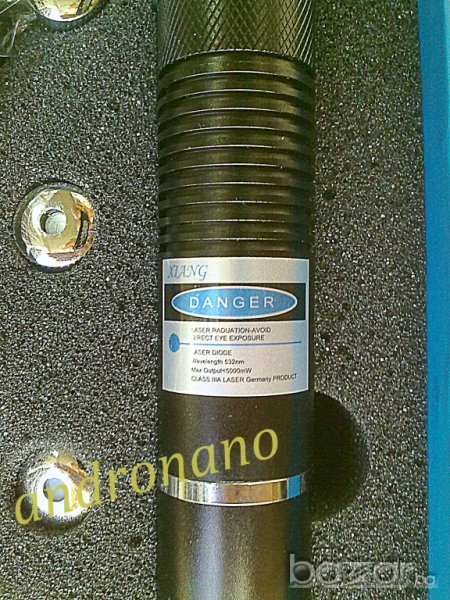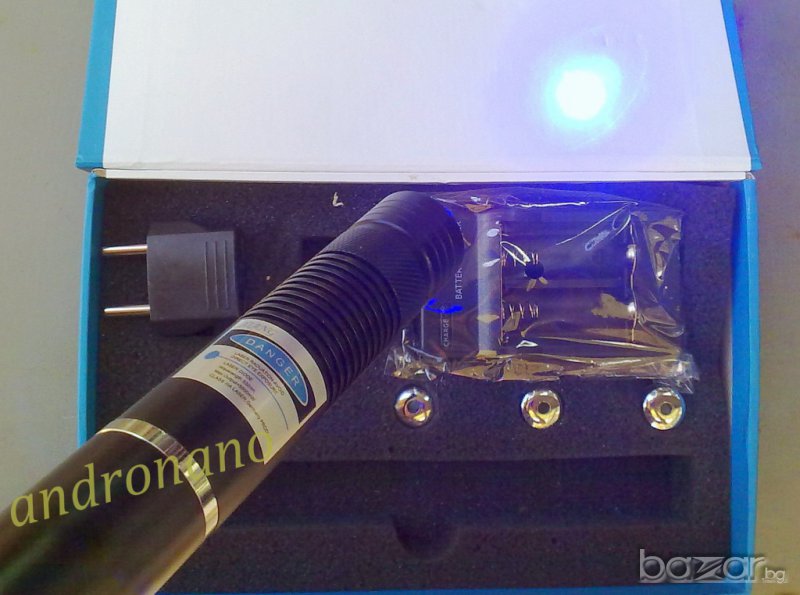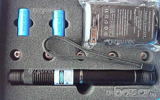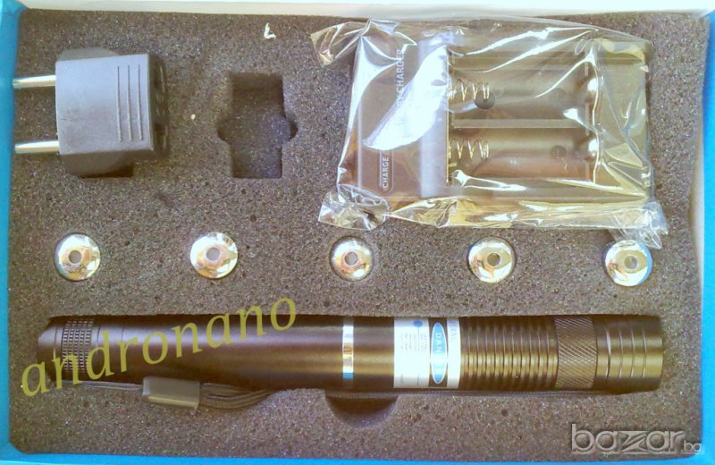 - Мощен син лазер с акумулатори и зарядно, пълен комплект. Възможност на регулиране ширoчината на лъча. Пет сменяеми дискотечни приставки с различни дискотечни ефекти.