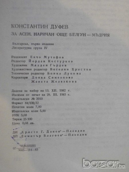Книга "За Асен наричан Белгун - Мъдрия - К.Дуфев" - 112 стр. → Обява 8105856