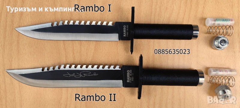 Двата ножа RAMBO II имат комплект за оцеляване в дръжката, който съдържа: компас, клечка за запалване на огън, драскало, корда и кукичка за риболов.