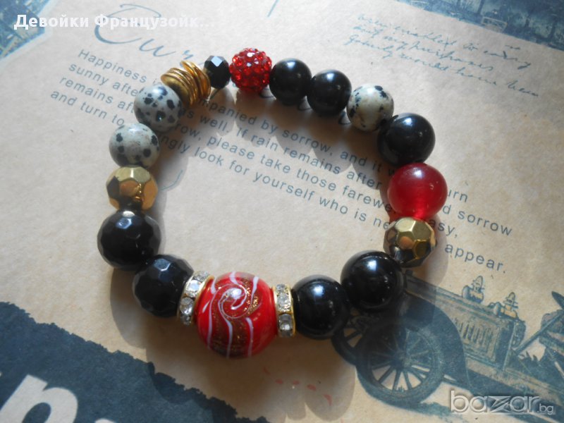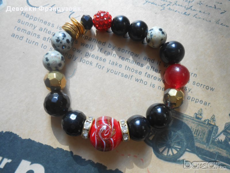 Красива гривна от естествени камъни (ахат и далматински яспис), стъклени перли, блестящи метални и кристални елементи. Гривната е нанизана върху двойна ластична основа. Диаметърът на елементите варира от 14 мм до 10 мм.