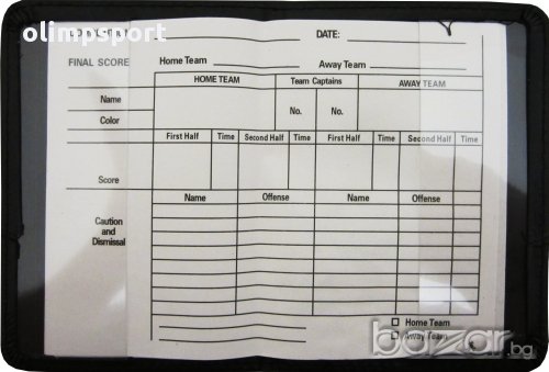 Съдийски картони комплект с бележник FIFA. Два отделни реферски картона жълт и червен с размери 11х8см. В джобове от двете страни на кожен калъф с размери 17х11.5см разгънат и 11.5х8.5см в сгънато положение. Комплектът включва и бележник на FIFA. Калъфът се разтваря като книга