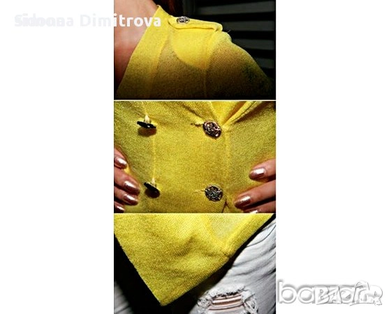 Жилетка тип сако в патешко жълто.Материята е тип финно плетиво.Разтеглива със 7/8-ми ръкави.