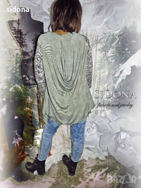 Модел тренч.Изработен от лека и фина материя с кожени ръкави.Интересен падащ гръб.Може да използвате и колан,за да оформите талията си.Размер:Free .