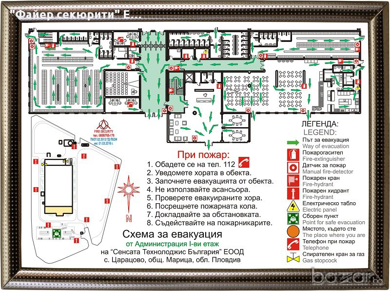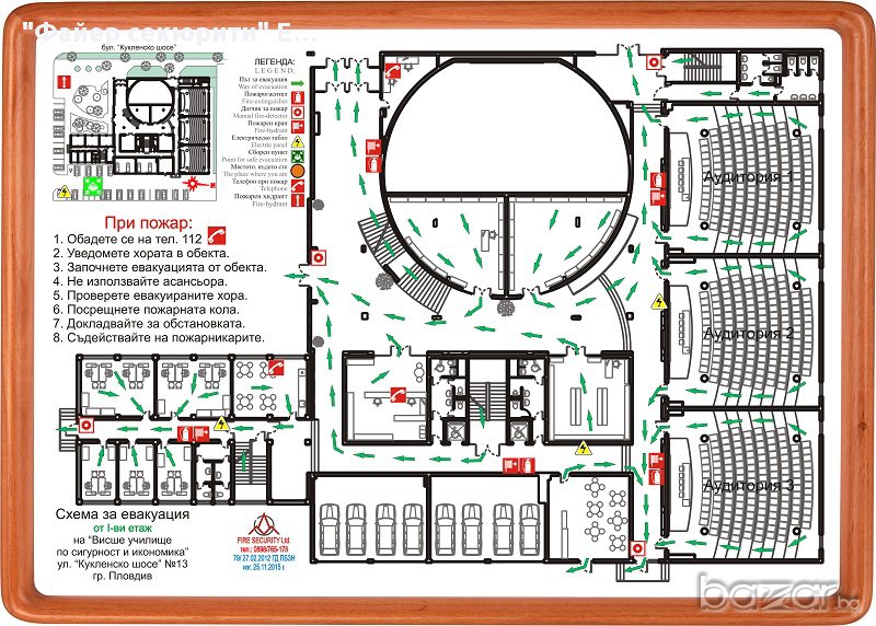 Схеми и план за евакуация по Наредба №8121з-647/ 01.10.2014 г. „За правилата и нормите за пожарна безопасност при експлоатация на обектите” (обн. ДВ 89/ 01.10.2014 г.).