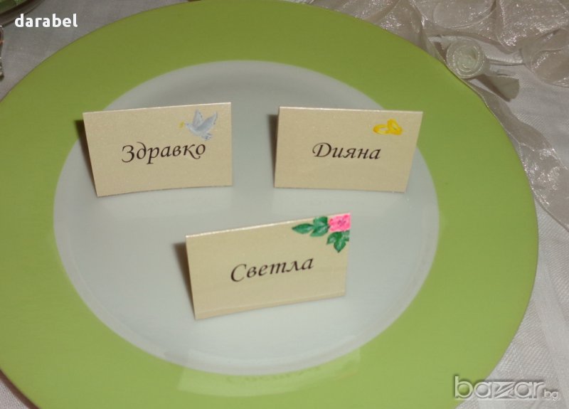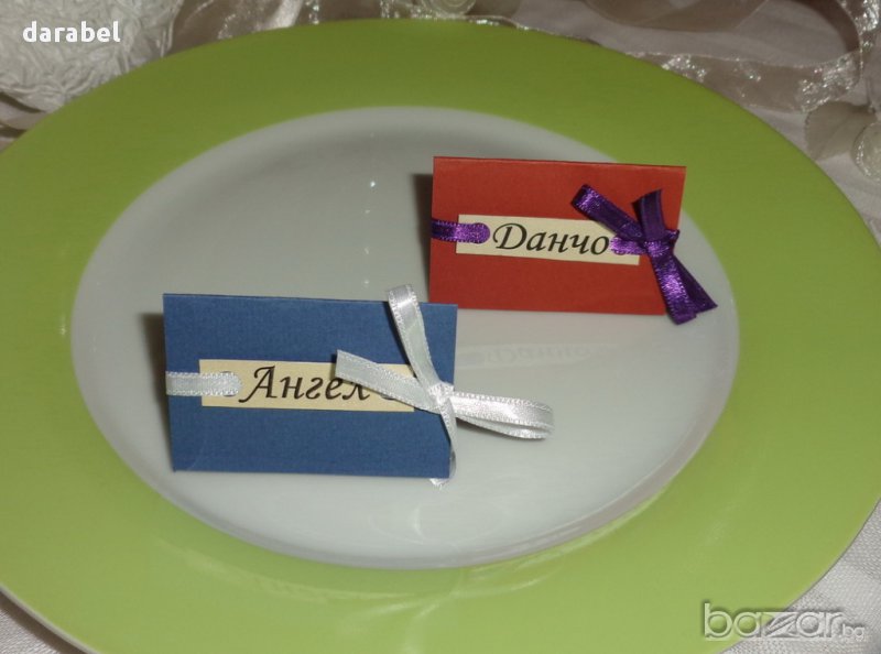 Ръчно изработени табелки с имената на гостите.Табелките могат да бъдат изработени в избрани от вас цветове.Цените са от 0.40-1лв.За повече информация посетете нашият сайт.http://darabel.com/
