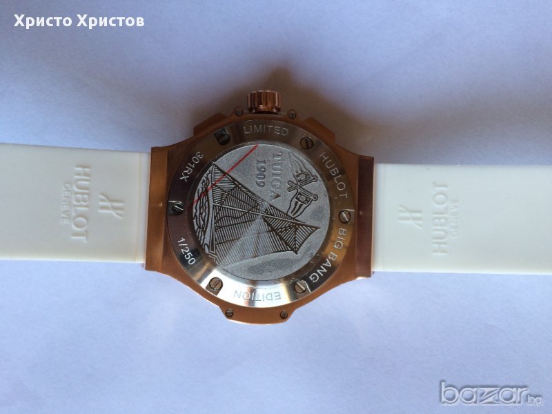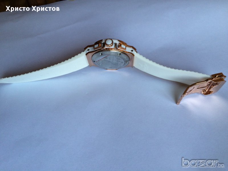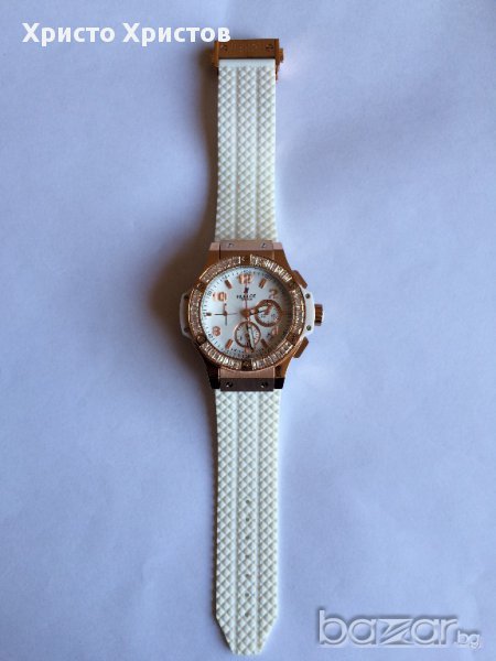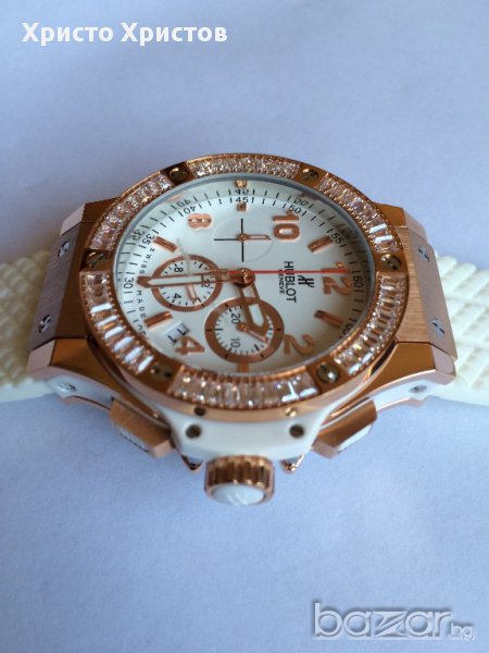 Внос от най-модерният завод в Хонг Конг!!!Перфектна изработка,няма нищо общо с масовките на пазара.Ръчен часовник дамски Hublot Big Bang King, кварц,сапфирено стъкло, стоманен корпус розово злато и бяла каучукова каишка.