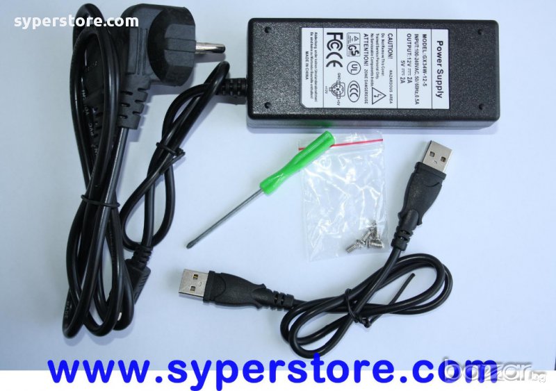 В комплекта се включка USB кабел и външен адаптер за кутияата.