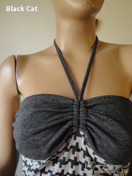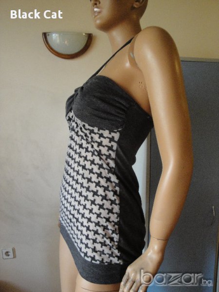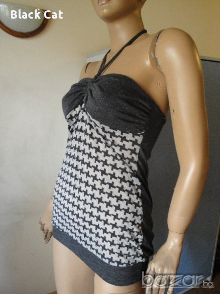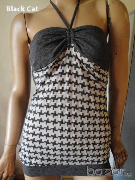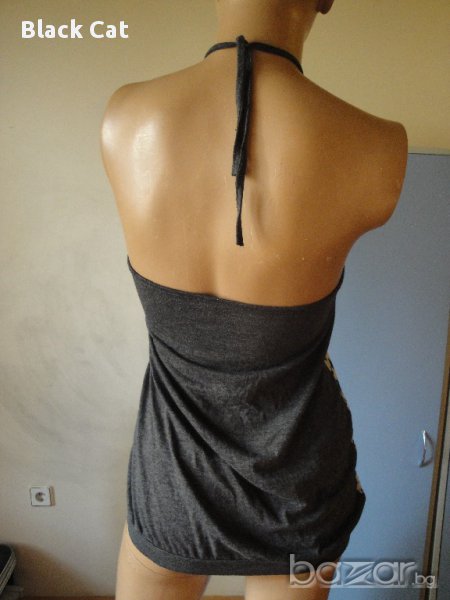 Предлагам атрактивен сив дамски топ с връзки. Носен няколко пъти, в отлично състояние, без никакви забележки. Етикетът с номера е премахнат, така че не мога да бъда категорична по отношение на размера, но мисля, че топът отговаря на S / M / L. Най-добре е да се ориентирате по мерките: дължина (без да включваме връзките) – 52 см, широчина – 38 см. Това, обаче, са приблизителните размери, тъй като топът е изработен от относително еластична материя, което би дало няколко см. отгоре, при нужда.