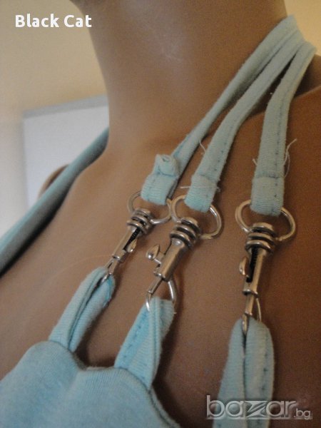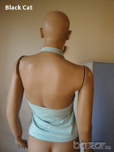 Предлагам атрактивен светлотюркоазен дамски топ с асиметрична презрамка, минаваща зад врата. Носен няколко пъти, в отлично състояние, без никакви забележки. Етикетът с номера е премахнат, така че не мога да бъда категорична по отношение на размера, но мисля, че топът отговаря на XS / S / M / L. Най-добре е да се ориентирате по мерките: дължина (включително презрамката) – 51 см, широчина – 36 см. Това, обаче, са приблизителните размери, тъй като топът е изработен от изключително еластична материя, което би дало доста см. отгоре, при нужда.