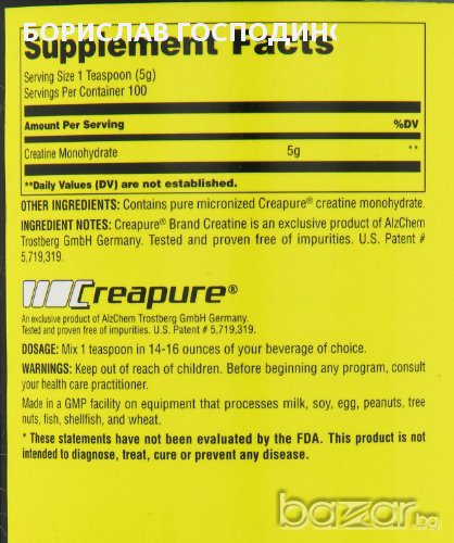 Смесете 1 доза 5 гр Creatine Powder в около 300-400 мл. вода, чай, кафе, сок или друга напитка.