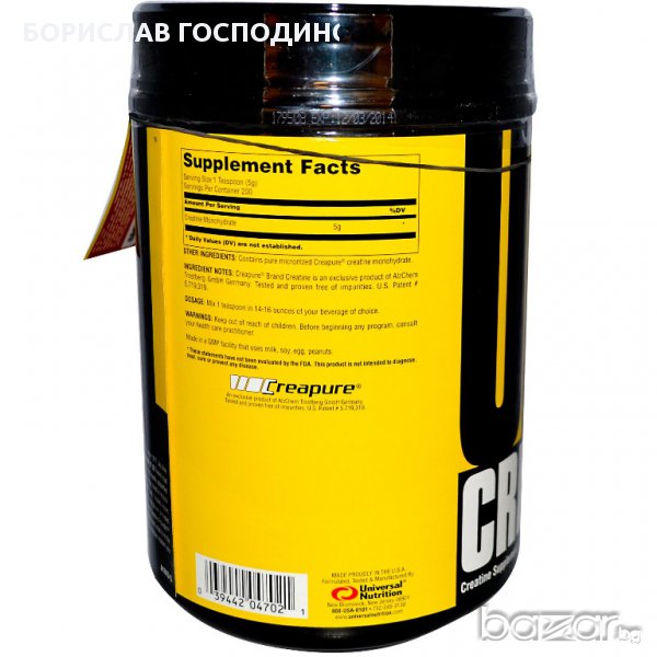 Креатин монохидрат на UNIVERSAL представлява немски креатин,който се смята за най-финият във света. АТФ (аденозин трифосфат) е източникът на енергия при изграждането на мускулна маса. Употребата на креатин води до увеличаване на силата и резултатите.Той помага за изграждането на чиста мускулатура,чрез хидратиране на клетките и увеличаване на техния обем,като създава необходимата анаеробна среда за растеж.