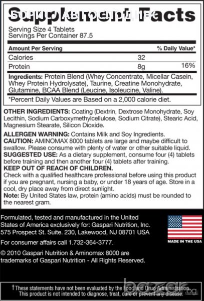 Gaspari Nutrition AminoMax 8000 са научно разработена комбинация от 91% хидролизиран лакталбумин от суроватъчен протеин, съдържаща протеини с изключително ниско молекулно тегло.Също така съдържа и ди- и трипептиди и индивидуални аминокиселини подсилени с допълнителни Левцин и Таурин.Ди- и три-пептидите се усвояват най-бързо от всички други форми на аминокиселините.Веднага след приемането си те се разграждат и постъпват в кръвта, а от там – в мускулите. Затова приемайте AminoMax 8000 преди или веднага след тренировка. Ще ви помогне за бързото и добро възстановяване на мускулатурата.