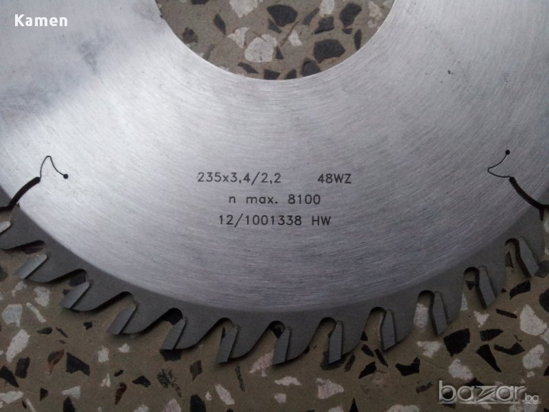 Диск за дърво hanogben:брой зъби 48;дебелина на диска 2.2мм;вътрешния диаметър е 75мм;вътрешен диаметър на ушите 91мм-13,4мм-08,4мм- външен диаметър 235мм;ширина на зъба 3,4мм