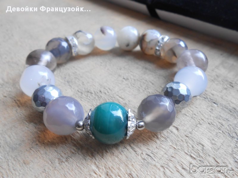 1. Гривна от естествени камъни- ахат "Драконови вени", ахат млечен и зелен ивичест ахат. Размер на мънистата: 12 мм. Гривната е нанизана върху двойна ластична основа и е декорирана с метални и кристални елементи.
