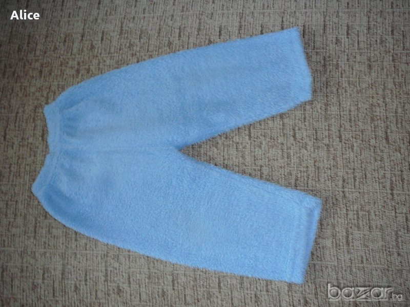 Комплектчето е в отлично състояние! Обличано е няколко пъти, без следи от употреба - като ново е. Много меко и топло. Размер 6-9 месеца /ръст 74/. Цветът е излязъл най-добре на снимка 2 /на панталонките/. Горнището е с копчета, а панталончето на ластик.