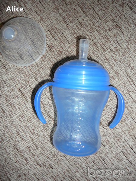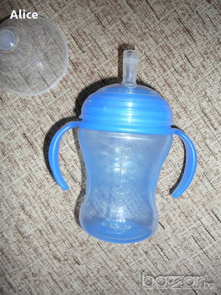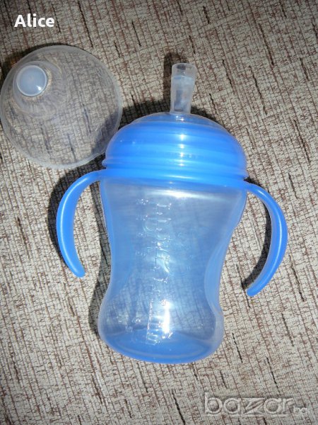 Чашата е нова, никога не е ползвана. Преди раждането на бебчо купихме цял комплект шишета с биберони, забравили сме я отзад в шкафа и затова си остана неизползвана. Детето вече си пие от обикновена чашка и тази не ни трябва. Опаковката беше за целия комплект (кашонче), не го пазя.