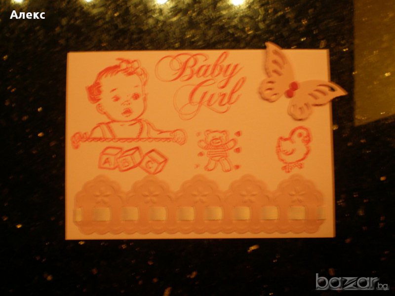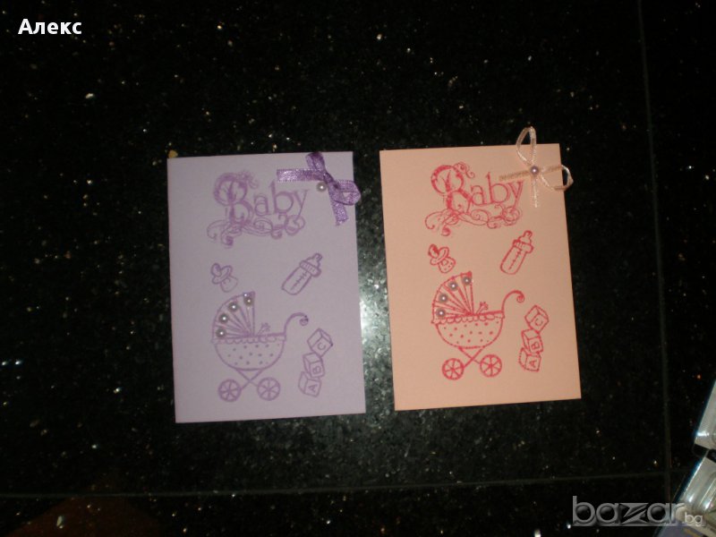 Ръчно изработени картички за бебе - момче и момиче. Изработени са от картон и сатен.Комплект с плик и целофан.Разгледайте и другите ми творения тук:https://www.facebook.com/handmade.brooches.alex/photos_stream?tab=photos_albums