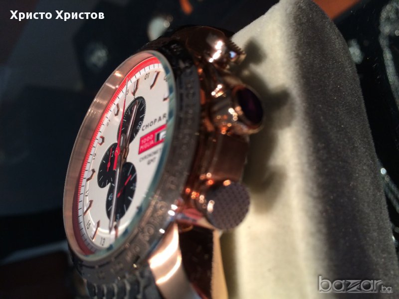 Ръчен часовник клас ААА+ реплика внос от Хонг Конг!Chopard 1000 Miglia,японски кварцов механизъм,46 мм,час,минути,секунди,дата, хронограф, стоманен корпус розово злато и каучукова каишка.Повечето вносители предлагат 6 месеца гаранция,заради по-ниското качество(бързо се изтрива покритието).