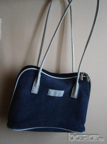 Дамска чанта от плат, имитиращ дънков с кожени дръжки. Може да се изполва както към спортно елегантни дрехи, така и към елегантни тоалети. Чантата вътре е с преграда, с голям джоб с цип,малък джоб за мобилен телефон или визитник и още един джоб с цип.