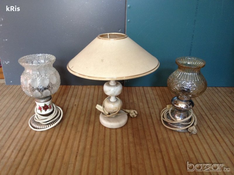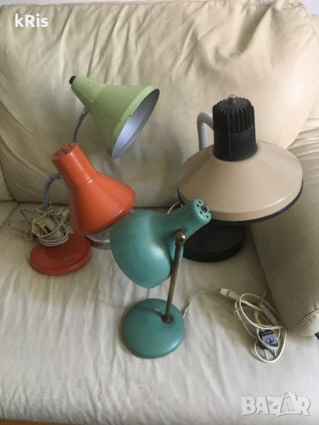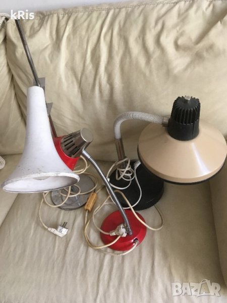 предлагам интересна ретро червена регулираща/работеща/ лампа=199лв, друга настолна стара красива лампа основа мрамор и плат сатен=99лв, тяло зелено от стара лампа, от край до край 41см и отвор за крушка 10см=69лв, няколко ретро лампи: настолна плетена 1949г с основа-ковано желязо =99лв, ретро висока цвят старо злато 'царска лампа',основа-метален триножник =249лв(7а снимка), цилиндър лампа плат бежов =49лв и няколко за бюро лампи :бялата сгъваема тип фуния-стил 'артДеко' е 249лв , имам и други кристални полилеи и аплици Бохемия + стари порцеланови фасунки ,розетки, ретро ключове,бушони,релета,прекъсвачи и контакти..