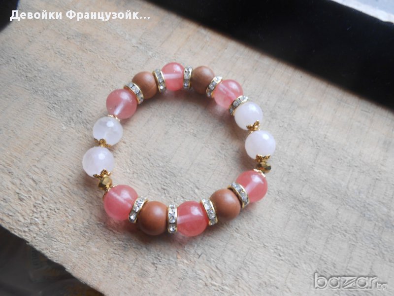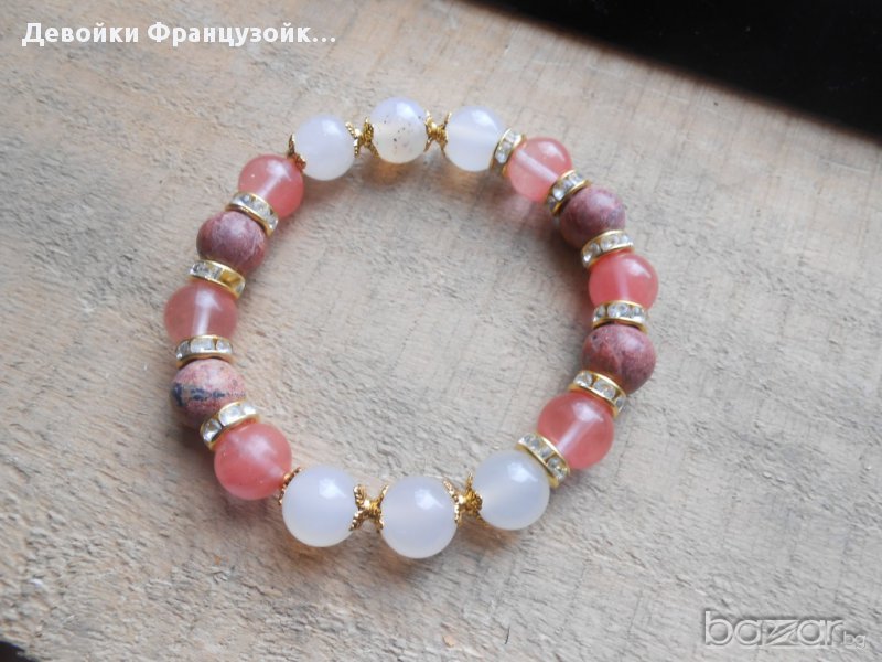 Елегантна гривна от естествени камъни (розов кварц, черешов кварц и яспис). Гривната е нанизана върху двойна ластична основа и е декорирана с блестящи кристални и метални елементи. Размер на мънистата - 10 мм