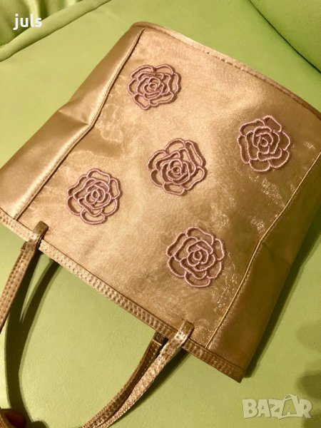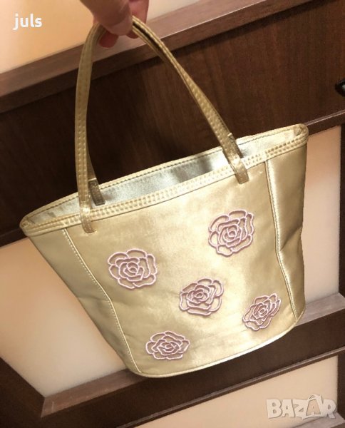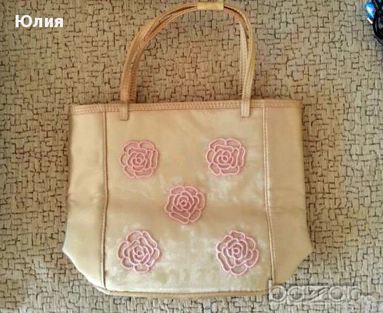 Малка златисто-бежова сатенена чанта с нежни бродирани цветя. Размер: 20,5/19,5/10 cm, овално дъно.
