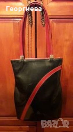 Дамска чанта в екстравагантна форма от черен лак с червени средно дълги дръжки и червена украсителна ивица. Чантата има твърдо дъно, две вътрешни разпределения, вътрешен среден джоб и фиксирано мяста за мобилен телефон.