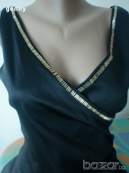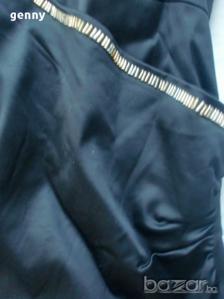 Прекрасна черна права рокля, чудесен силует, материя и кройка...Роклята е уникално красива, има само една забележка – златното покритие на някои от елементите леко са е изтрило при единственото изпиране на роклята....Има вариант да се изтрият всички и да си останат прозрачни при следващо изпиране, или да се разшият всички, или да се носи и така защото не се забелязва, ако не се вгледаш...За това цената на роклята е символична – 25 лв.
