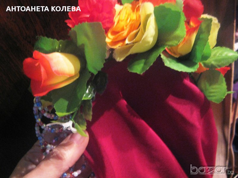 нова, дамска кърпа с накити - мъниста и цветя, които не се свалят цвят - цвета на кърпата - наситено зелено, бяло, насотеночервено, оранжево, жълто