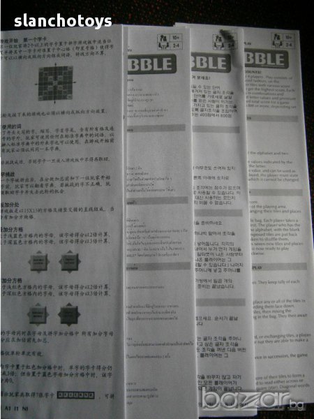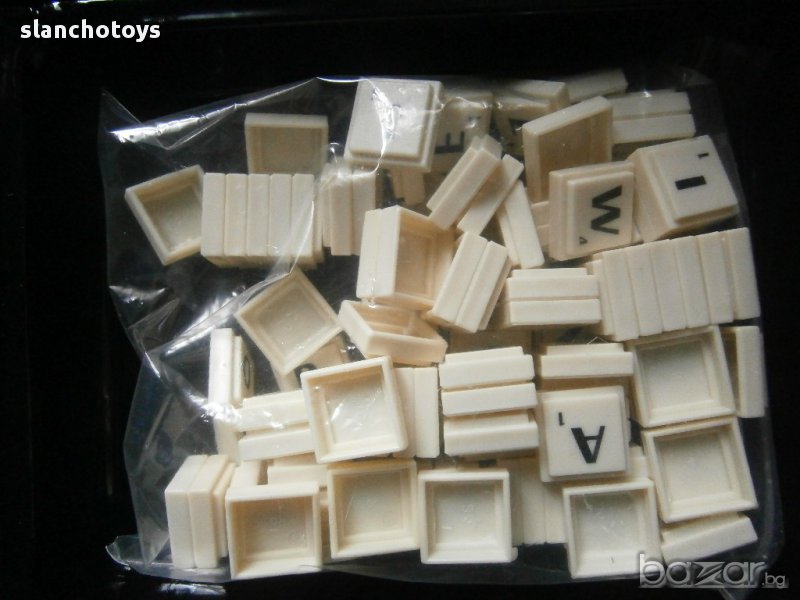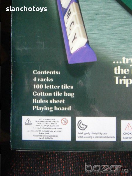 Скрабъл, с английски букви, със 100 плочки, с поле и поставка за буквите ,размер на таблото 35/35, а на кутията, среден размер- 19/35,5см. Голямата цена е 25лв, а туристическият е 16лв.