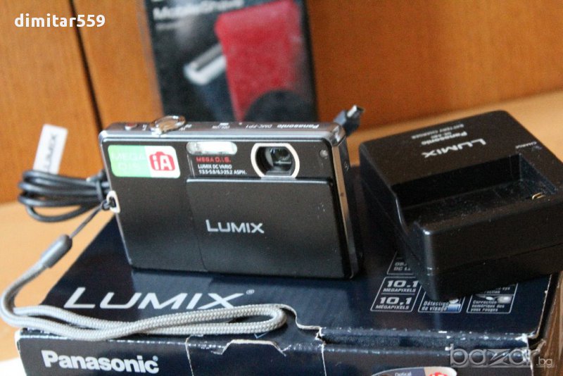 Panasonic Lumix DMC-FP1 12 мегапикселов с титаниев корпус и капаче върху обектива, пълен комплект с кабели, зарядно устройство. Работи перфектно и безупречно, подходящ е за детективска работа, поради компактните си размери и доброто снимане на тъмно и на документи от близко разстояние. Ето едно видео на модела, за да добиете по-добра визуална представа тук: