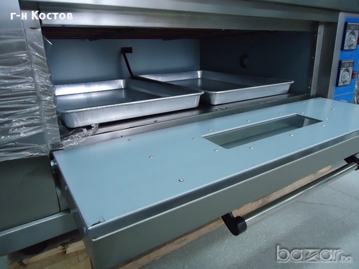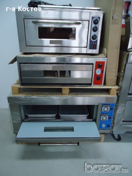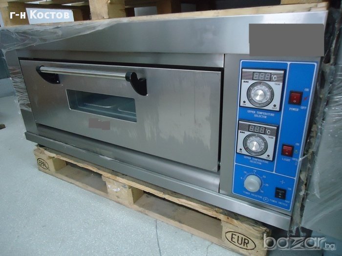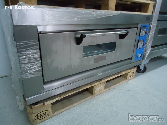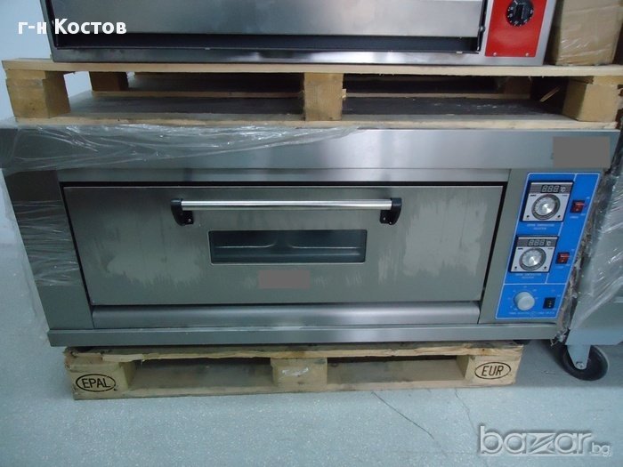 1. За хлебни изделия пици и закуски фурна нова на едно ниво за 2бр. тави 60/40см.,внос от Европа 6 KW - външни размери височина 58см.,широчина 1.26см.,дълбочина 85см., вътрешни размери камера за печене широчина 85см.,дълбочина 65см.,, една година гаранция.