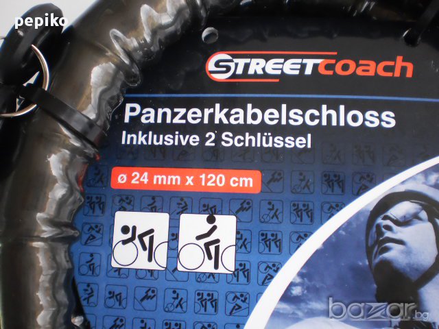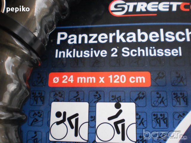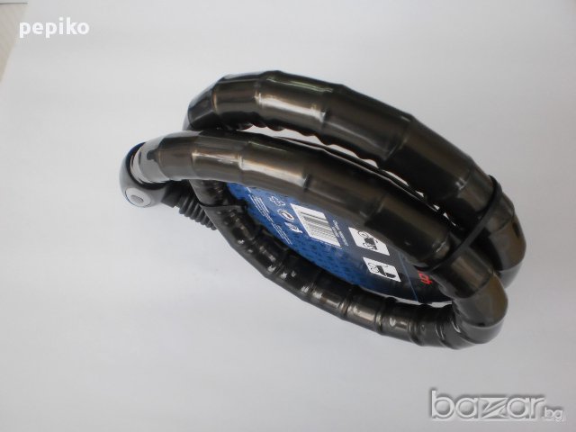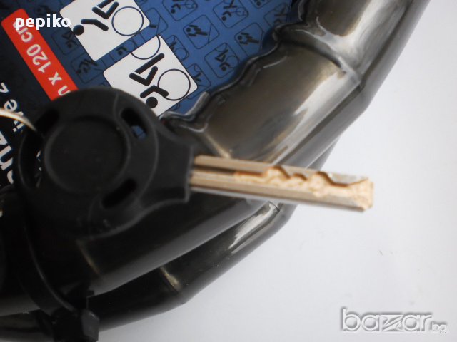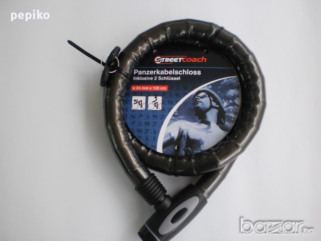 НОВА ключалка , заключващо устройство за велосипед , мотопед модел 2014г, заключващото устройство е произведено за Германия, много здраво,плътно тяло покрито с пластмасово покритие, дебелина на веригата ф20, дължина 120 мм, предпазна капачка на ключалката, два ключа с пластмасови глави,ключовете са секретни по последна технология с вътрешни жлебове, ключалката е много добре защитена.