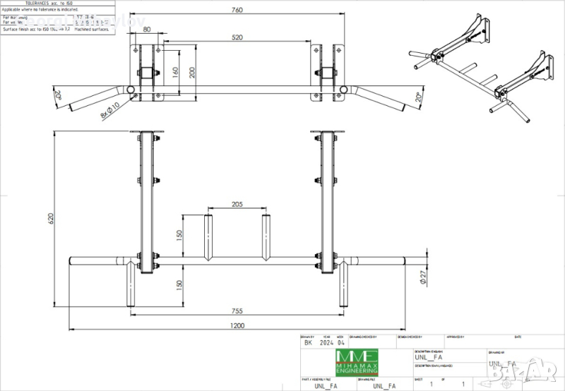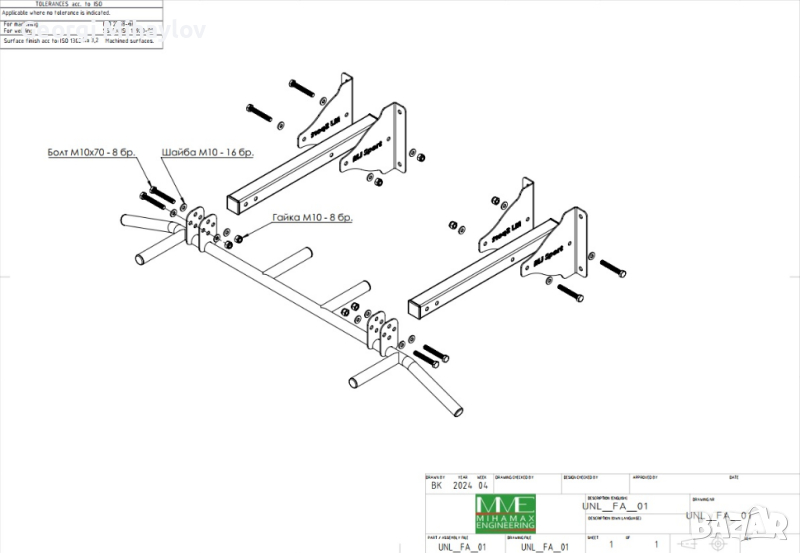 * Захващане на лоста към стойките с 4 болта М10 и самоосигурителни (стопорни ) гайки- включени в комплекта;