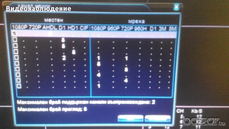 Хибриден режим: при аналогови камери (AHD DVR): 8 * AHD-L / 8 * D1 / 8 * HD1; аналогови камери + IP камери (HVR): 2 * D1 (аналогов) + 1 * 1080P (IP) + 1 * 720P (IP); Само IP камери (NVR): 2 * 1080P / 4 * 720P / 8 * 960H / 1 * 1080P + 1 * 720P + 2 * D1