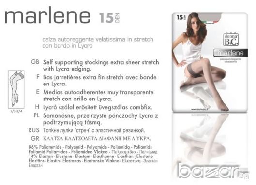 Donna BC Marlene 15 гладки чорапи с ластик на италианската марка за чорапи и чорапогащи Donna BC / Донна БС. Продуктът представлява прозрачни чорапи със завършващ широк ластичен кант; не е необходим жартиер, за да се носят; уплътнени пръсти. На всеки един артикул е удостоверено, че артикулът е Произведен в Италия (Made in Italy). Цената е за 1 чифт = 2 бр. чорапи.