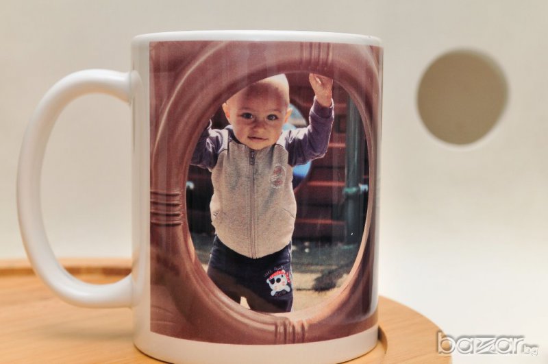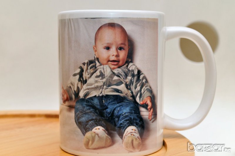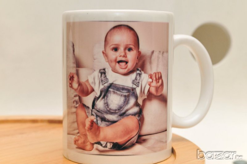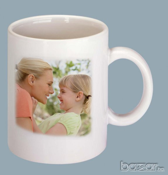 Бяла керамична фото чаша със снимка, надпис, картинка, лого, емблема или фирмен знак по Ваша идея или дизайн.