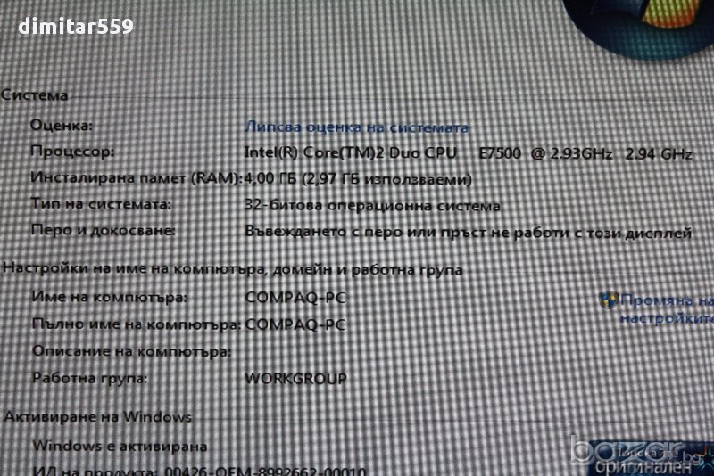 А тук следват техническите характеристики на модела: Серия Compaq 500B. Процесор Intel Dual Core (ТМ)2 Duo CPU E7500 2.94 GHz / 1366 MHz, 3 MB L3 cache. Чипсет Intel G41 Express Core Qwad 4. Памет, MB4000 MB DDR3 1DIMM. Твърд диск, 500 GB SATA2. Оптично устройствоDVD+/-RW LS. ВидеоIntegrated Intel Graphics Media Accelerator X4500 HD 1Gb. За игри може да поставите допълнителна, макар че и тая с 1 гигабайт и 256 битова позволява да се играят почти всички игри. Звукова карта Integrated High Definition audio with Realtek ALC662 codec. Мрежова карта Integrated Realtek 8103EL 10/100 Ethernet Controller Модемn/a. Разширителни слотове 1 full-height PCI, 1 full-height PCI Express x16, 2 full-height PCI Express x1. Интерфейс 6 броя USB 2.0, 1 RJ-45, 1 VGA, audio in/out, Mic In. Четец за карти 22 in 1. Купуван е преди 2 години за 827 лв., а сега ще го продам за не по-малко от 350 лв., като цената не се коментира, нито предоговаря. Пращам и по куриери, само след резервация в сайта и предварителна уговорка по телефона, съответно и капаро. Ако имате интерес, моля звънете на тел 0877487040, ако не отговарям на телефона пишете на съобщения във формата за контакти със продавача срещу обявата във сайта! Питайте или поръчайте, ваша воля! Желая ви успешен ден!