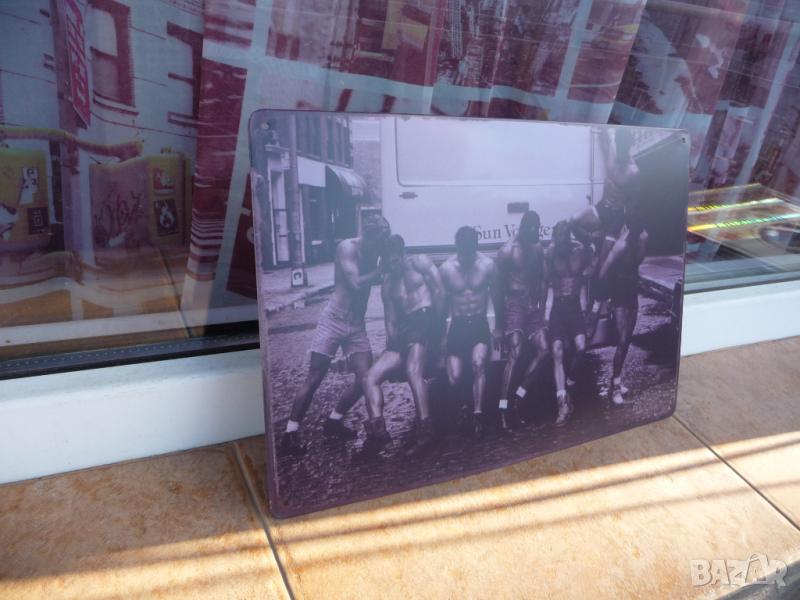 Метална ламаринена табела - Силни, мускулести момчета бутат рейс.