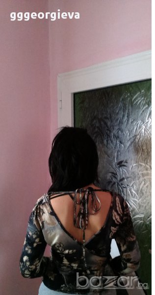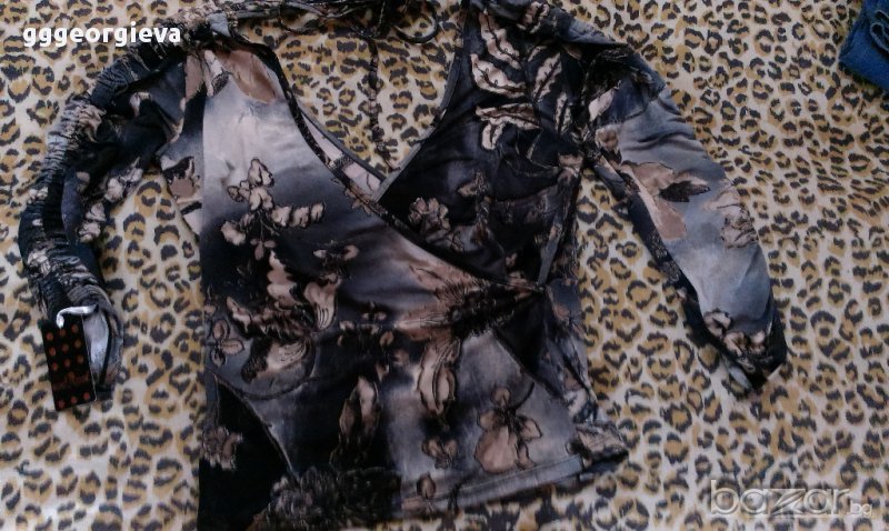 Шарената блуза е с етикет. В-образно деколте. Надолу има връзки, интересен модел Подходяща е за поводи и по-специални случаи, цена 12 лв