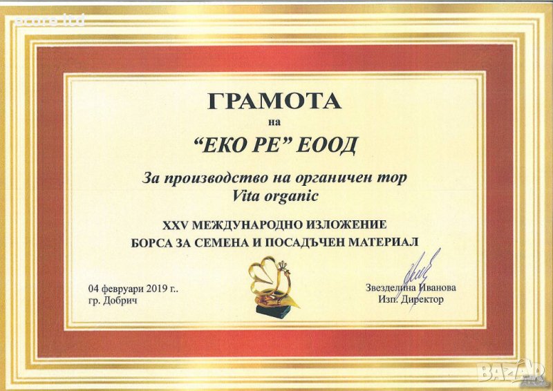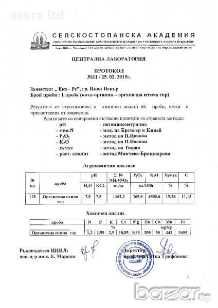 Рекорден Добив В Земеделието !!! N, P, K, Ca, Mg, S макро елементи и Zn,B, Mn, Cu, Fe, Mn микро елементи - отлични показатели. VITA Organic органична тор с доказано качество за получаване на голям добив от преработена птича тор и дървесна пепел,800 лева гранула за основно торене и микронизирана за листно торене или 200000 литра срещу 800 лева за тон !Органична птича тор VITA ORGANIC за био и конвенционално земеделие разрешена от БАБХ и сертификат от СЕРЕС Германия . Вече продукта ВИТА ОРГАНИК може да се ползва и признава на 100 % в БИО ЗЕМЕДЕЛИЕТО от всички сертифициращи фирми към Дирекция