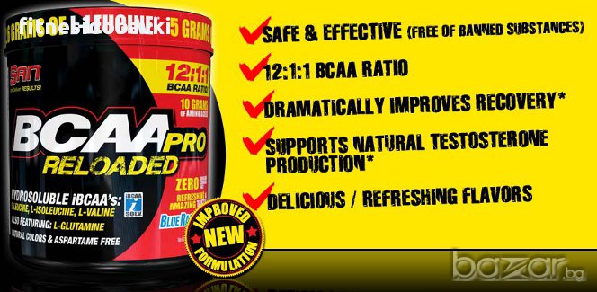 San BCAA Pro Reloaded 12:1:1 Ви осигурява ВСАА, но по съвсем нов и револючионен начин !Повечето подобни продукти доставят тези аминокиселини в съотношение 02:01:01, което по принцип е добре, но не осигурява подходящо анаболно задвижване. Продукта BCAA Reloaded доставя L-Leucine – 6300 мг, L-Изолевцин - 525 мг, и L-Валин – 525 мг във всяка доза, и то в уникално мощното съотношение 12:01:01! Формулата на продукта включва също така микронизиран L-глутамин – 2500 мг, за допълнително насърчаване на възстановяването. ВСАА аминокиселините, които BCAA Reloaded съдържа, са по-разтворими във вода и по-бързо се абсорбират. Това означава че Вие можете да постигнете свръх резултати, за относително кратък период!