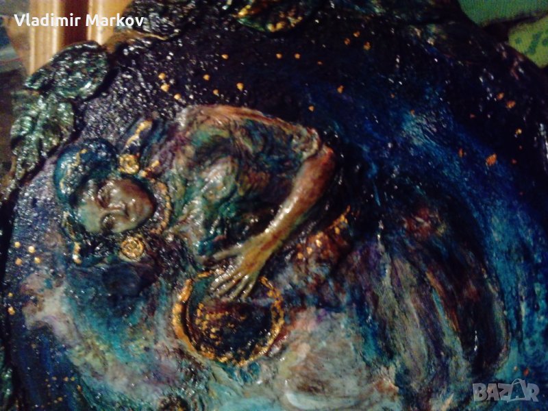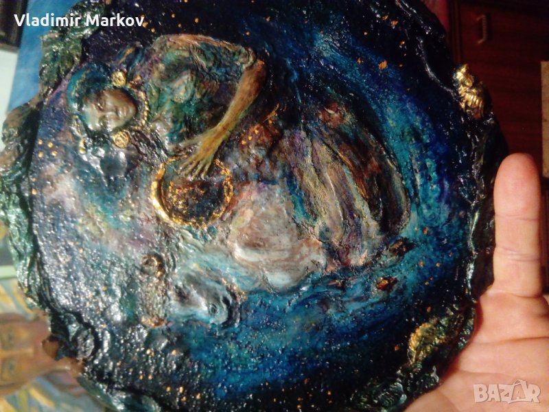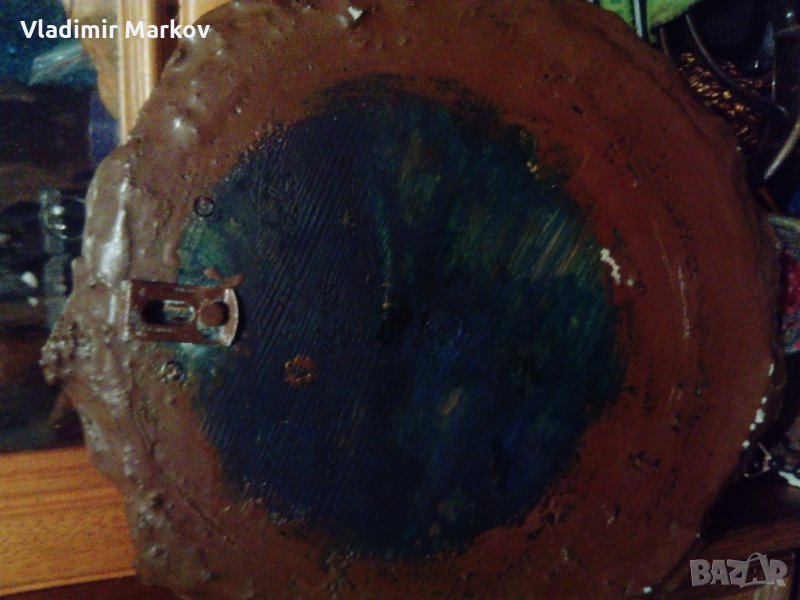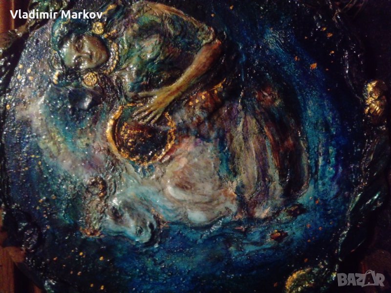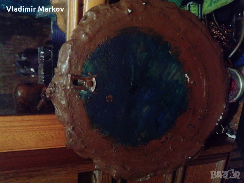Картината е рисувана на дърво-пластични орнаменти на листа и плодове=насекоми обрамчват картината като рамка-Подписана от задна страна-гравирано в/у дървото-Michalis Apostolos 1949 Athens-Razmeri-24 sm -диаметър