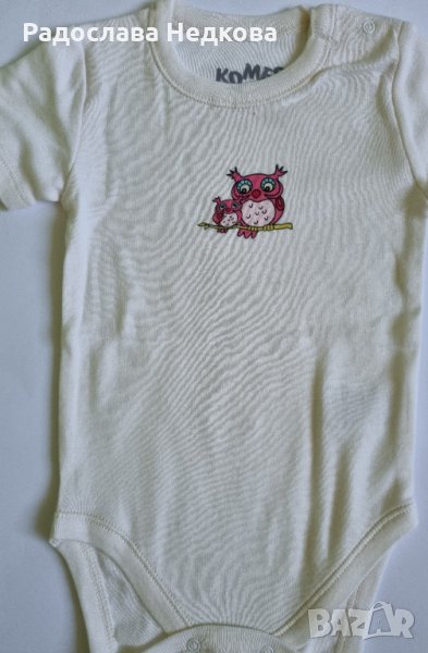 Страхотно памучно боди с къс ръкав с апликация на бухалчета. Българско производство! Размер 68 см.