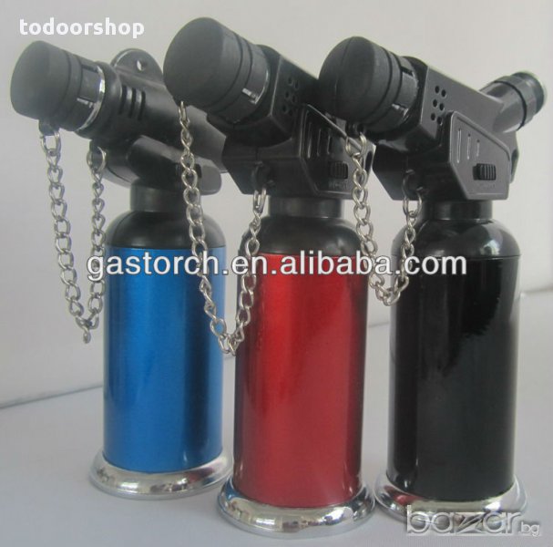 Работи с пропан бутан газ. Снабдена с резервоар за многократно зареждане, регулиране на подаването. Зарежда се катко обикновените запалки. Запалване чрез пиезо кристал.