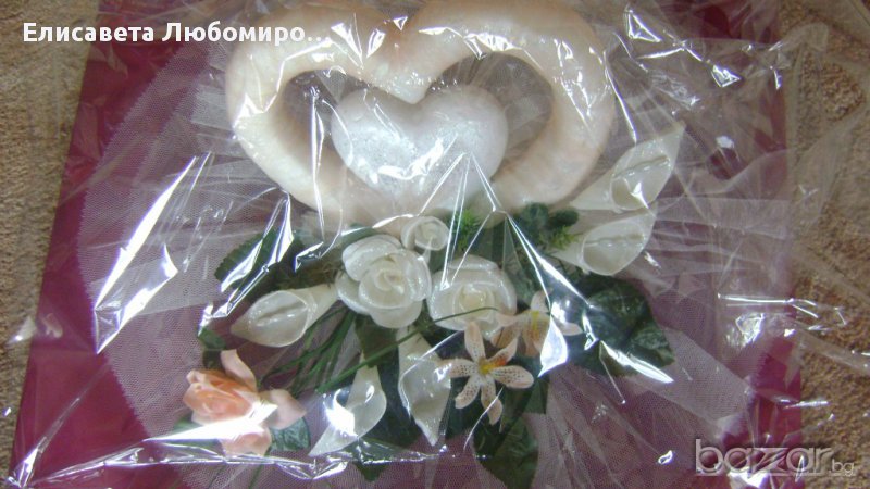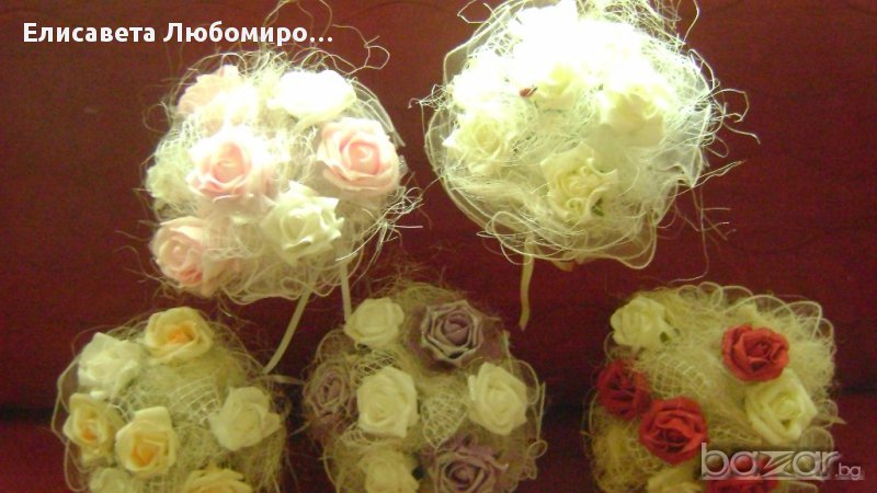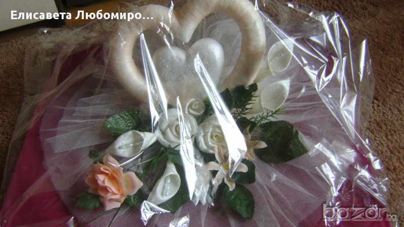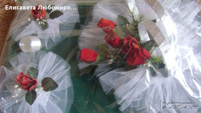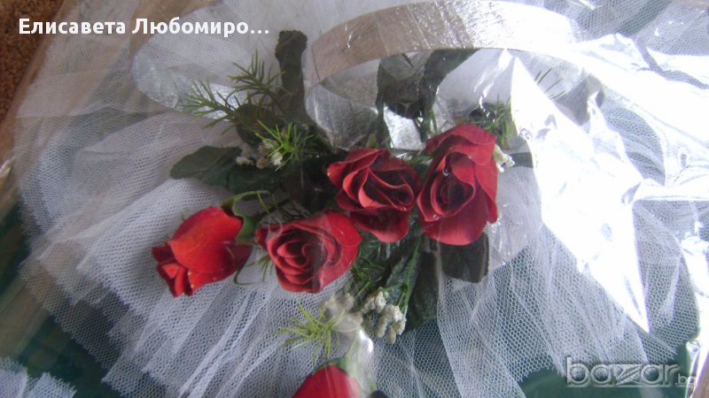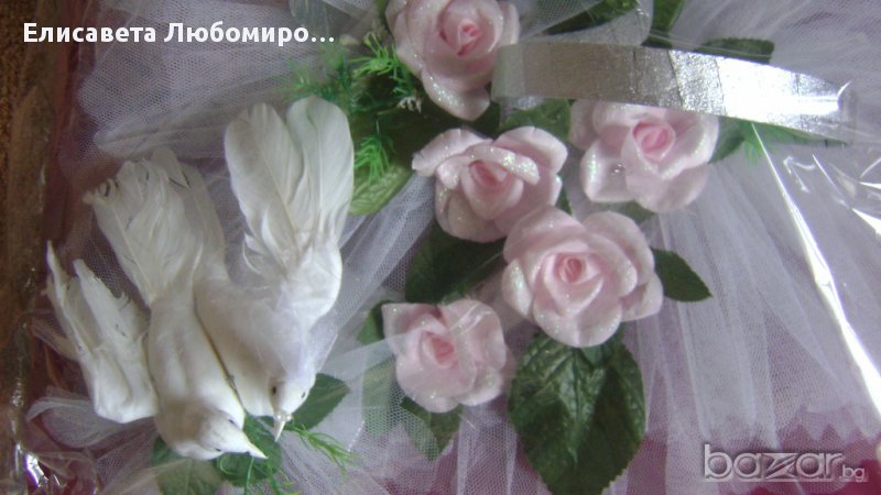 украса за кола изкуствени цветя,-лилиуми и рози-на вакум,може да се добави елемент или цвят по ваше желание,украса с гълъби с розови рози-на вакум,украса - 3 части с велурени рози в бордо и сребърни халки-на вакум ,украса с 2 сърца в бананово и шампанско-на вакум.-цена-45лв. Украси с гълъби - 3 части в бананово,,розово -цена-25лв Букети-7 рози-12лв. малки-8лв.Висящ-20лв.