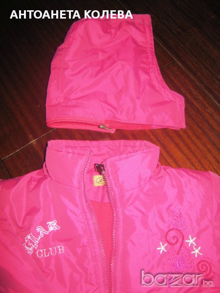 много запазено цикламено яке с качулка, която се сваля, отвътре с полар, на кръста с ластик без скъсано или леке, много запазено, без забележки